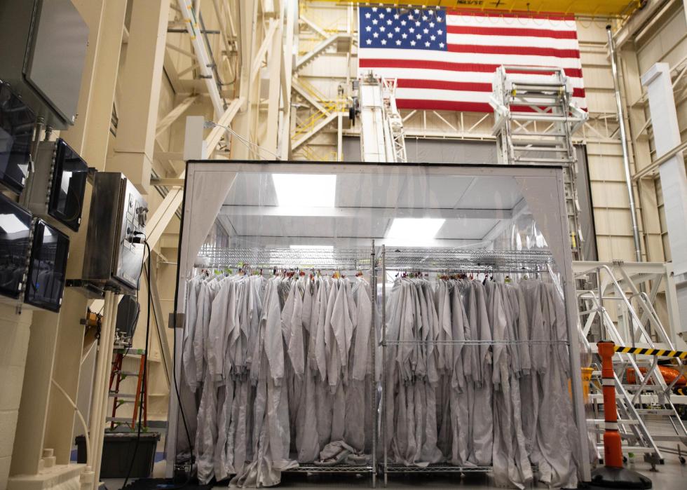 [Pictured: Containment suits are seen at NASA where they unveiled the Orion Space Arts and crafts. The spacecraft is the first step in NASA's Artemis Lunar mission; aiming to land the beginning woman and next man on the moon by 2024.]