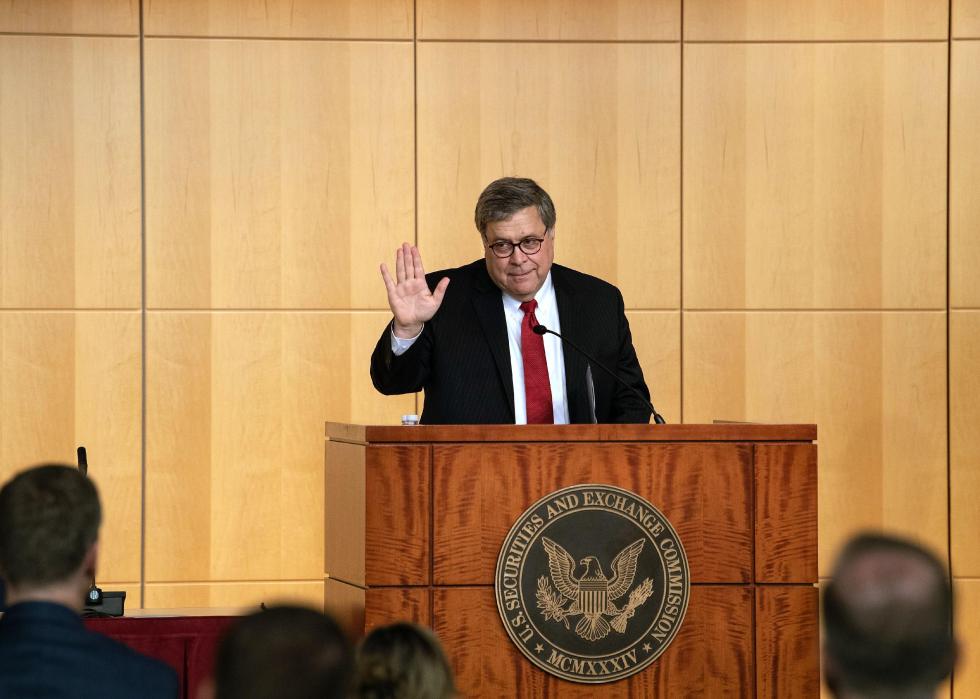 [Pictured: U.S. Attorney Full general William Barr speaks at the SEC's Criminal Coordination Briefing in Washington D.C., on October. 3, 2019.]